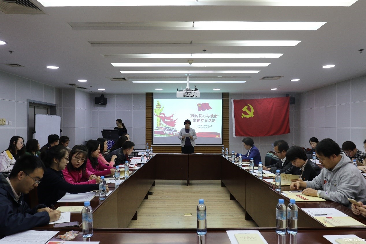 活动伊始,支部党员全体起立,奏唱《中华人民共和国国歌》。庄严的歌声过后,党支部书记吕晓慧同志首先介绍本次主题党日活动的背景和意义,并对“不忘初心、牢记使命”主题教育进行动员。习近平总书记在“不忘初心、牢记使命”主题教育工作会议上指出,为中国人民谋幸福,为中华民族谋复兴,是中国共产党人的初心和使命,也是激励一代代中国共产党人前赴后继、英勇奋斗的根本动力。吕晓慧强调我校是第二批主题教育参加单位,基层党支部要做实学习教育和检视整改,保障主题教育效果。最后,她对支部开展主题教育的工作计划和工作部署做出明确指示和要求。