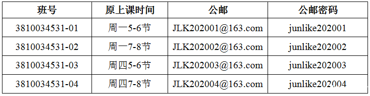 1.线上学习期间军理课原有班级不变,每个班级安排助教并设置公邮,便于师生之间发布信息和交流答疑,公邮为学习期间公共平台,请大家珍惜爱护。相关公邮、助教等联系方式,详见附件2。