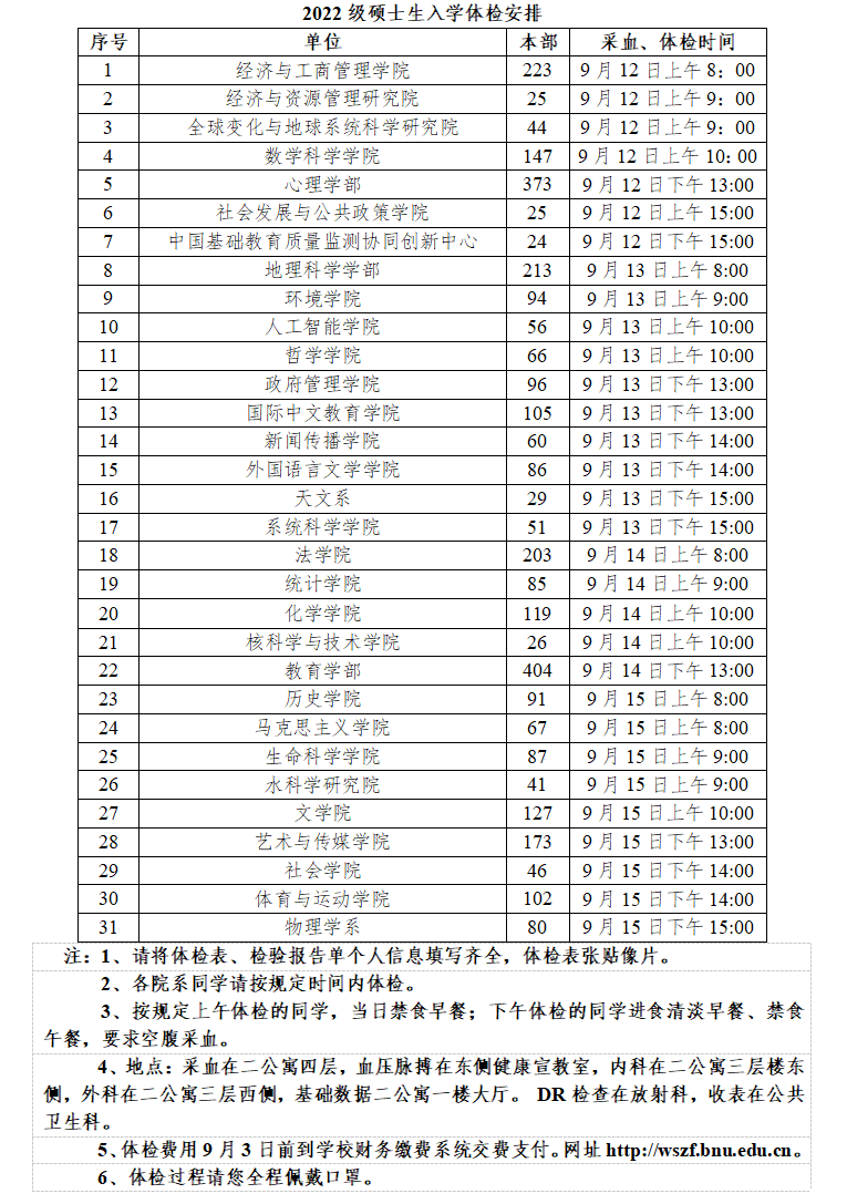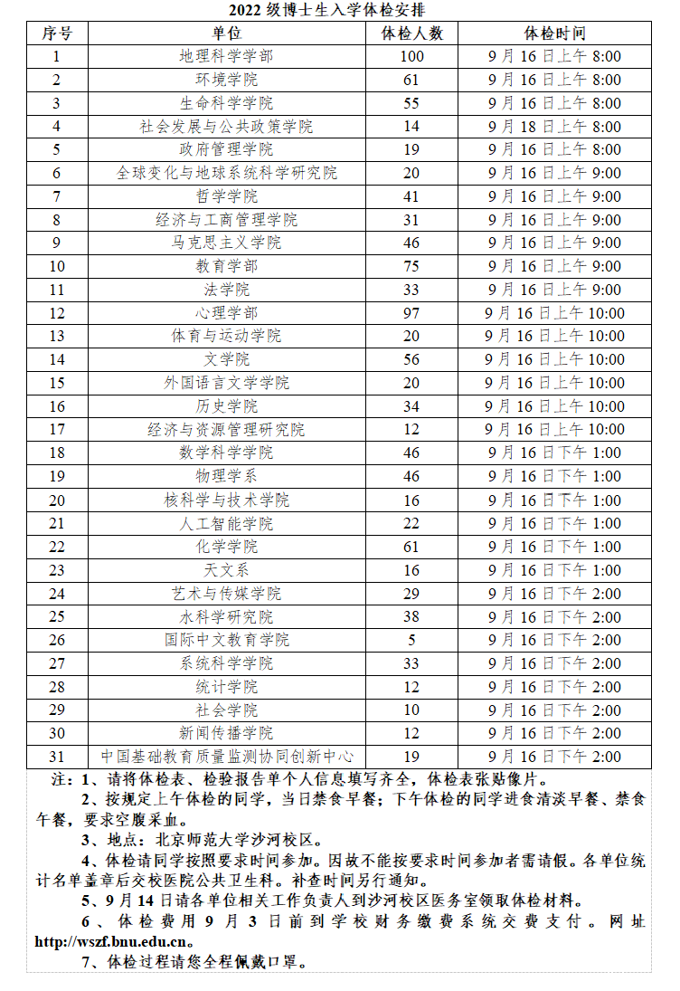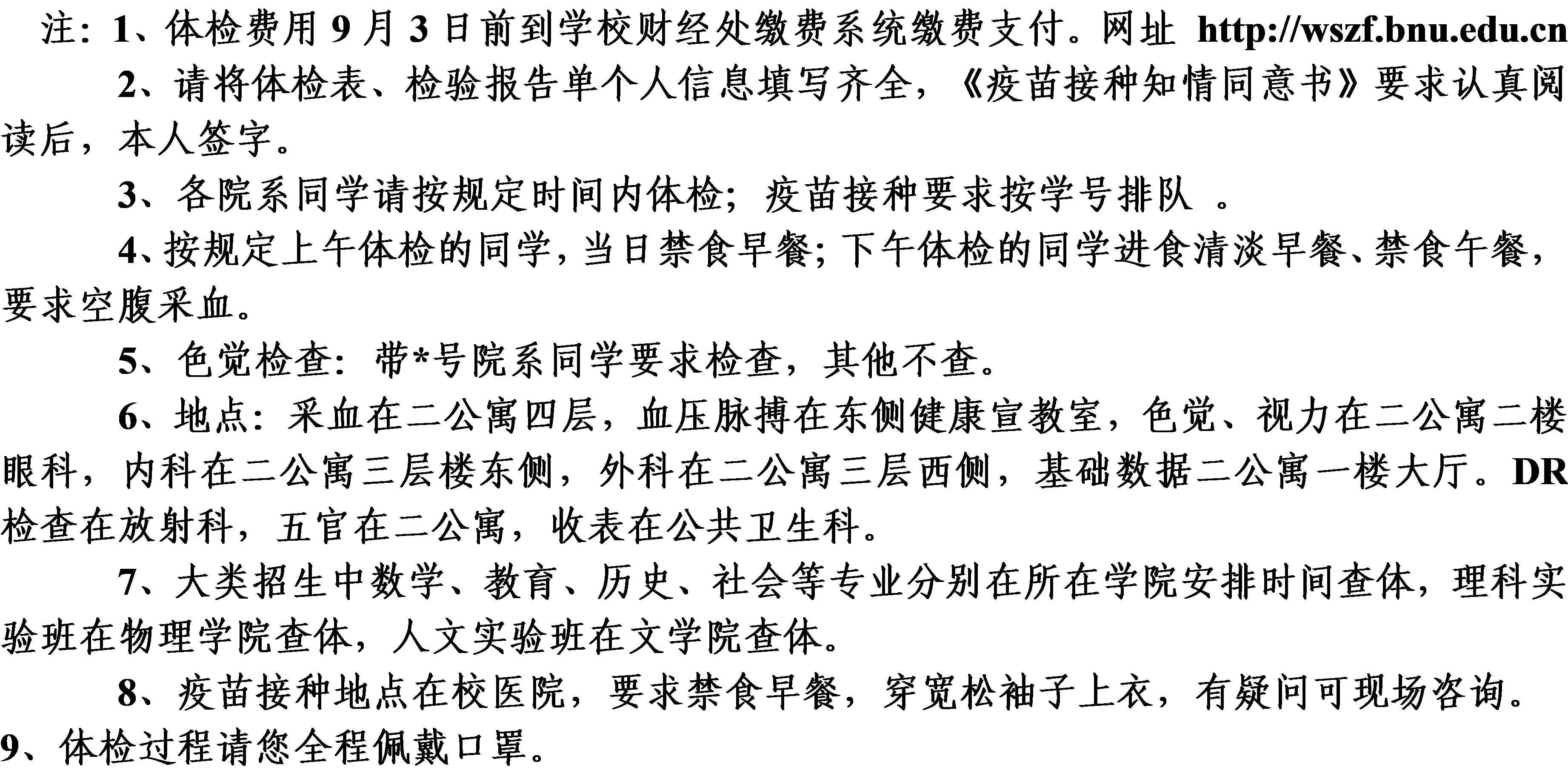 1.体检费用9月3日前到学校财务缴费系统交费支付。网址http://wszf.bnu.edu.cn。