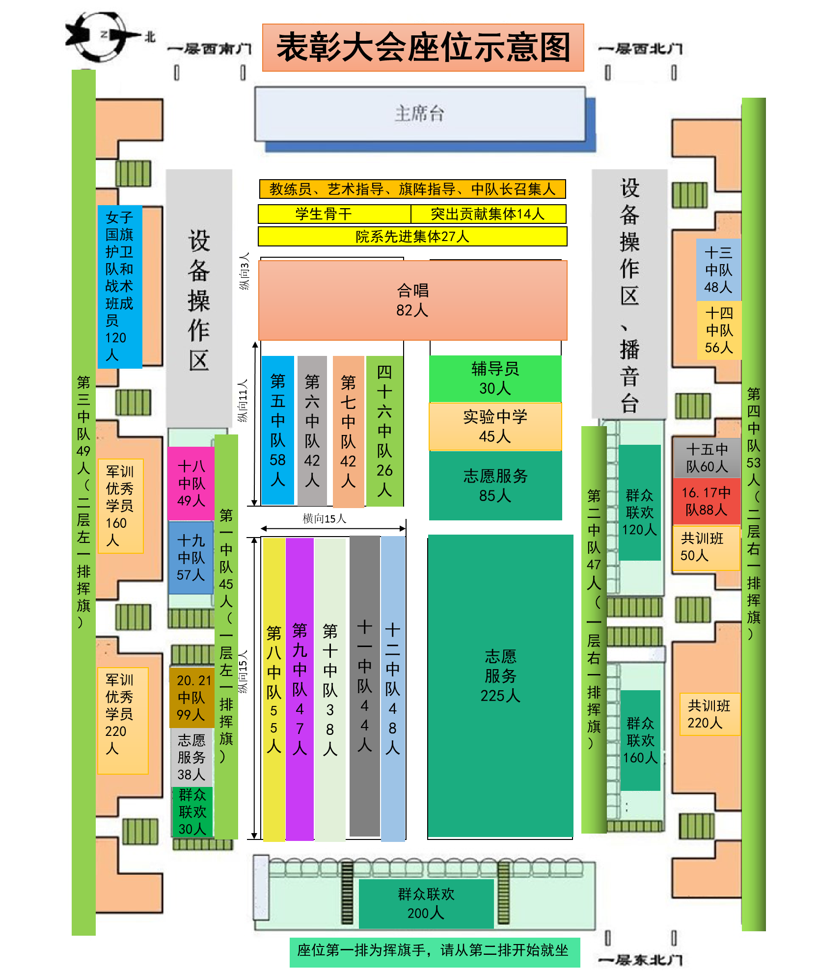 2. 请带队教师组织学生于10月27日9:30统一入场,9:50之前入场完毕(入场方案见附件2),并按照座位分区(见附件3)有序就坐。26方阵各中队长负责组织本中队学生统一入场,入场后以中队为单位就坐;音乐表演、群众联欢、志愿服务团队学生由校团委相关教师组织入场;各学部、院系2019级本科生班主任(带队教师)组织本单位军训优秀学员统一入场;其他辅导员入场后在指定区域集中就坐。