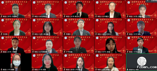 评选大会上,20位候选学生结合成长经历生动讲述了自己的励志故事。在家庭物质支持和资源保障不足的情况下,同学们不畏困难和压力,把生活上的阻力变为自身前行的动力,自强不息、志存高远。他们中有热心公益、躬身实践的志愿者,有怀揣梦想、立志深耕三尺讲台的未来教师,有潜心学术、探索学科前沿的科研新星,也有心怀家国、一身戎装的国防践行者等。虽然他们的故事各有不同,但是他们都同样用青春书写着无悔、用奋斗书写着梦想,展现出了北师大学子的良好风貌。