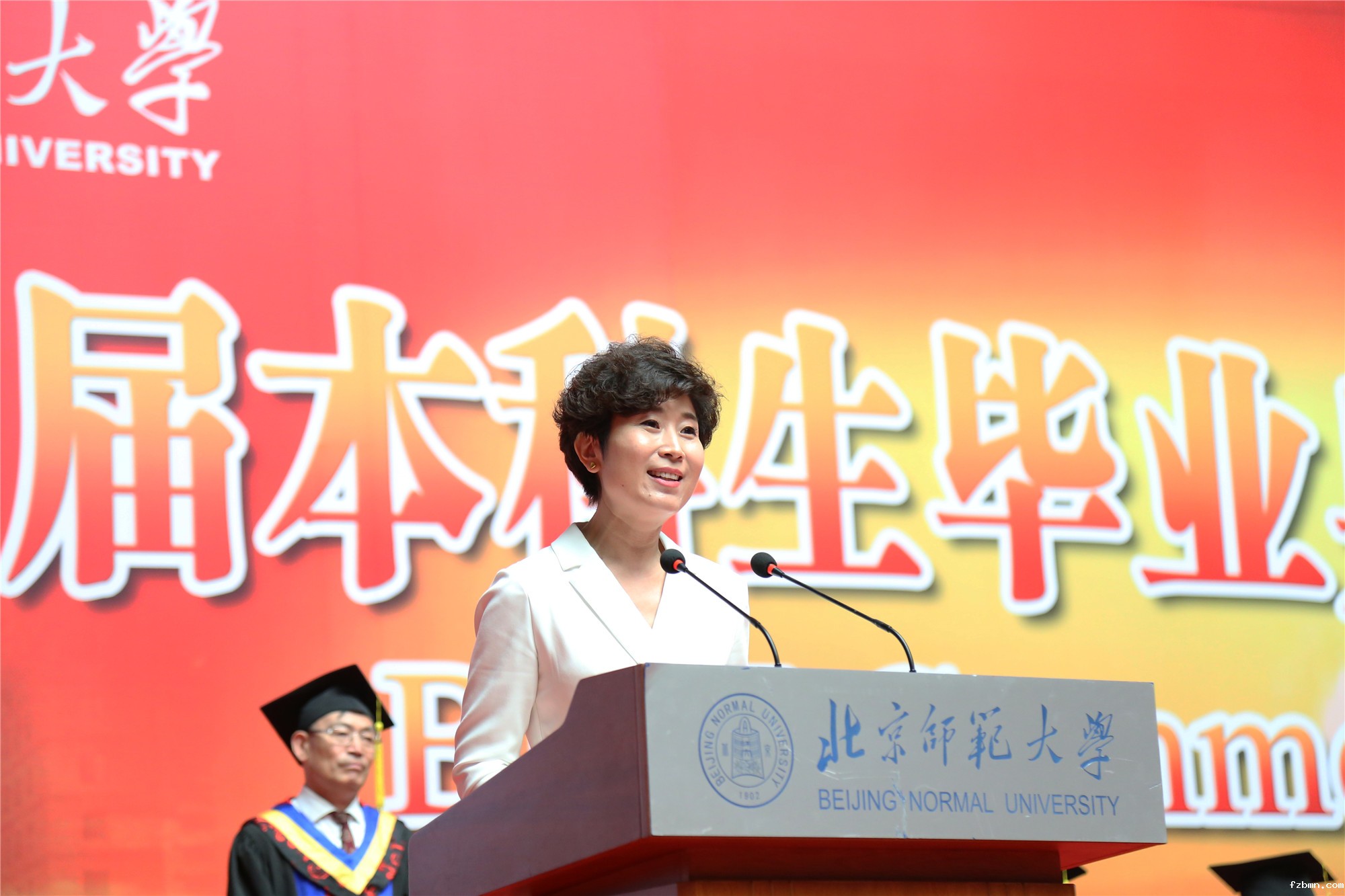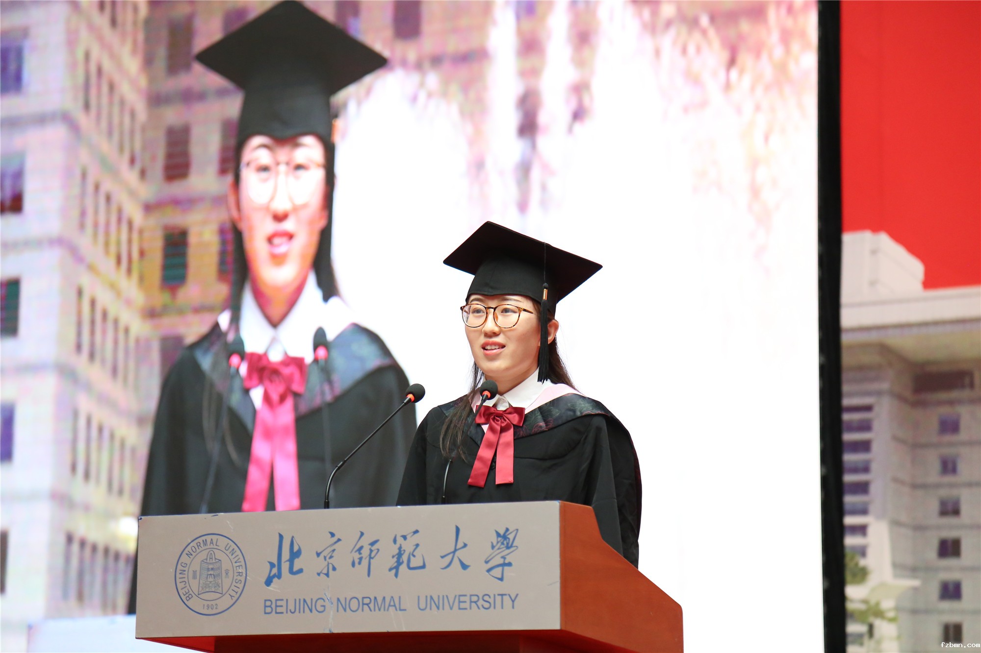 历史学院张慧同学作为毕业生代表发言。她回顾了与师大的相遇、与教育的结缘,讲述了自己为中国而教的信念,表达了对母校的感谢、对师友的祝福,倡议毕业生们脚踏实地、敢为人先,以兼济天下的气魄担当新时代青年的责任。