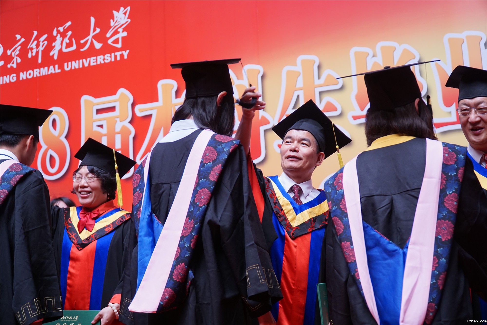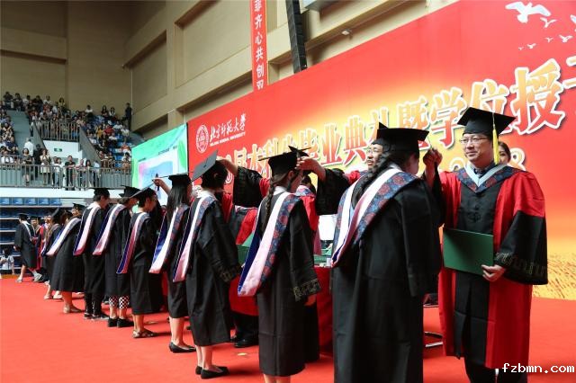 出席典礼的学校领导和学位评定委员会委员为毕业生颁发毕业证书,并扶正流苏授予学士学位。学位授予仪式结束后,全体师生齐唱校歌,全场响起了热烈的掌声,同学们喊出了“感谢师大”“祝福母校”以及“毕业快乐”等口号。