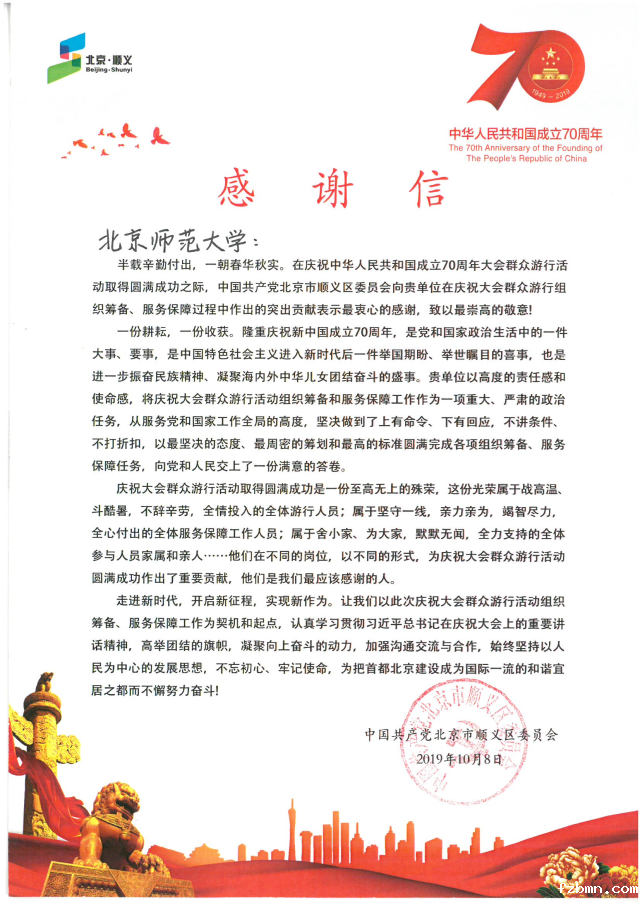 2019年10月8日,中国共产党北京市顺义区委员会向我校发来感谢信,对我校在新中国成立70周年庆祝大会群众游行组织筹备和服务保障过程中作出的突出贡献表示感谢!