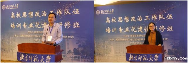 10月31日下午,研修班举行结业式,四位学员代表汇报研讨情况和学习心得。他们表示此次培训班正当其时,培训内容具有指导性、针对性,培训形式灵活多样,学员学习态度认真,会务工作细致周到。同时对高校思政工作队伍建设提出了宝贵建议,他们希望各单位加强学习资源共建共享,推进课程体系研究与课程精品化建设,针对少数民族地区开展辅导员专题培训,继续扩充师资库等。
