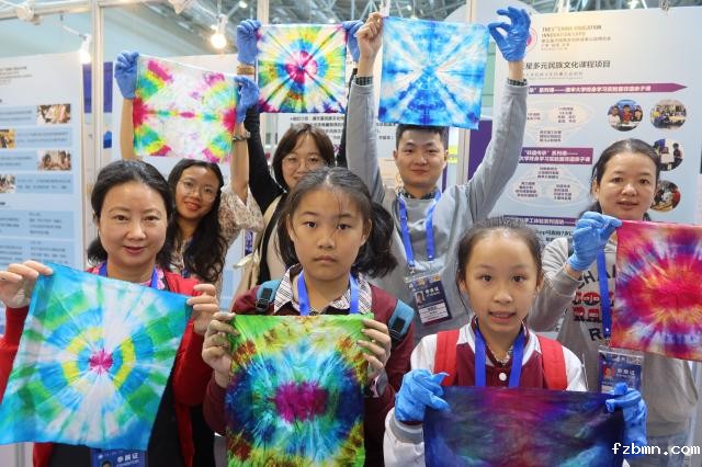 展会期间,学生创新成果展区引起了广泛关注。其中,满天星民族文化传播公益组织展示了贵州侗族“鼓楼”、杭州西湖“雷峰塔”等少数民族建筑模型,并邀请现场观众体验白族“扎染”制作过程。